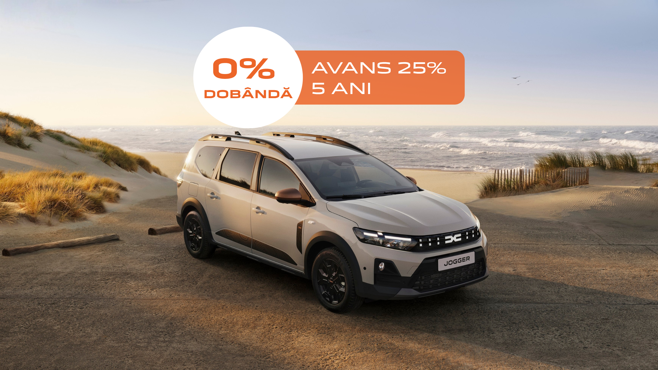 Rată lunară 240 euro fără tva, pentru noul Jogger essential Eco-G 120 (5 locuri) în valoare de 15702 euro fără TVA, a fost calculată la un avans de 25%, pentru 60 luni. Produsul include valoarea contractului tip garanție extinsă Dacia Extenso, valabil 24 luni sau 120.000 km (prima limită atinsă), și valoarea contractului de întreținere Easy Service, valabil (reviziile periodice menționate în carnetul de întreținere al autovehiculului) 5 ani de la livrare sau 120.000 km (prima limită atinsă), ITP și cu asistență rutieră cu autovehicul de înlocuire în limita a 3 zile.